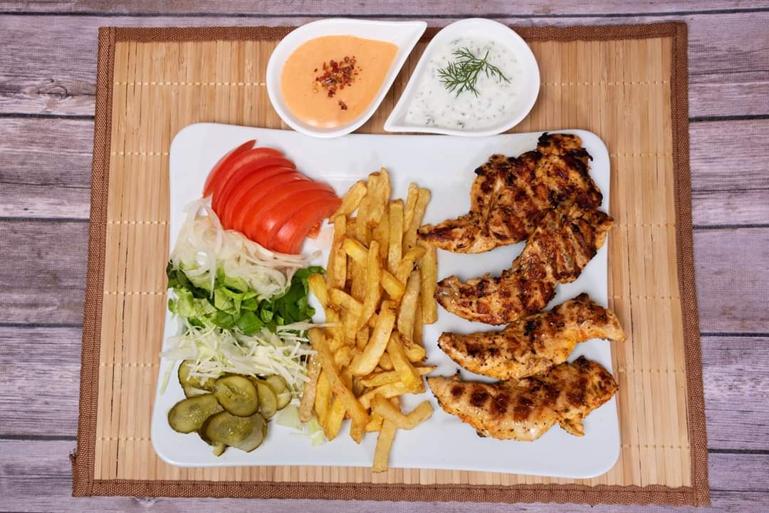 Ingrediente: Carne 250 Gr , Cartofi prajiti ,Orez cu legume, piure la alegere, Varza Sosuri , Chifla / Lipie