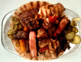 Ingrediente: 200 gr ceafa, 200 gr piept pui, 2 mici, 2 buc coasta porc, frigaruie pui, cartofi wedges, castraveti murati